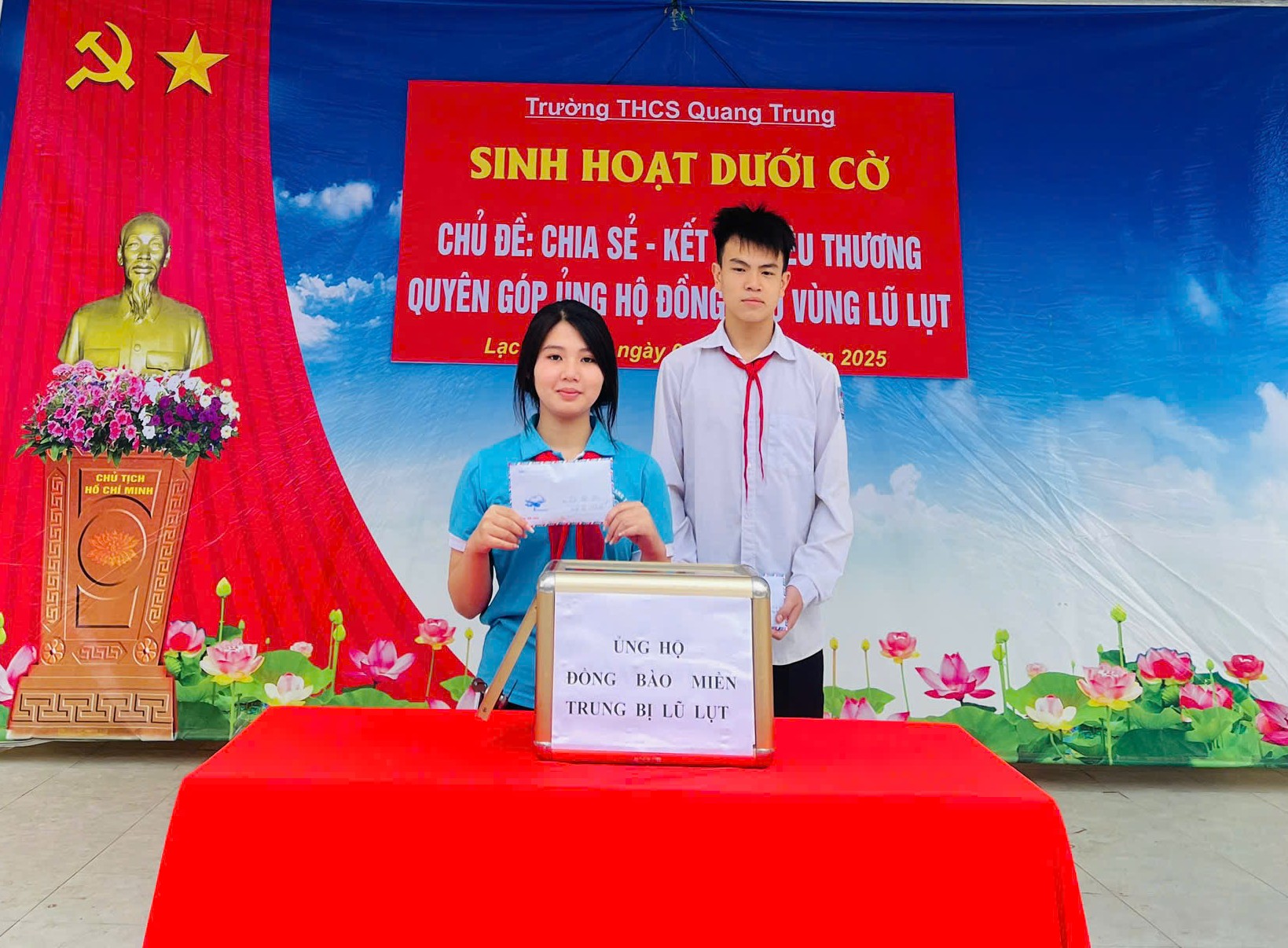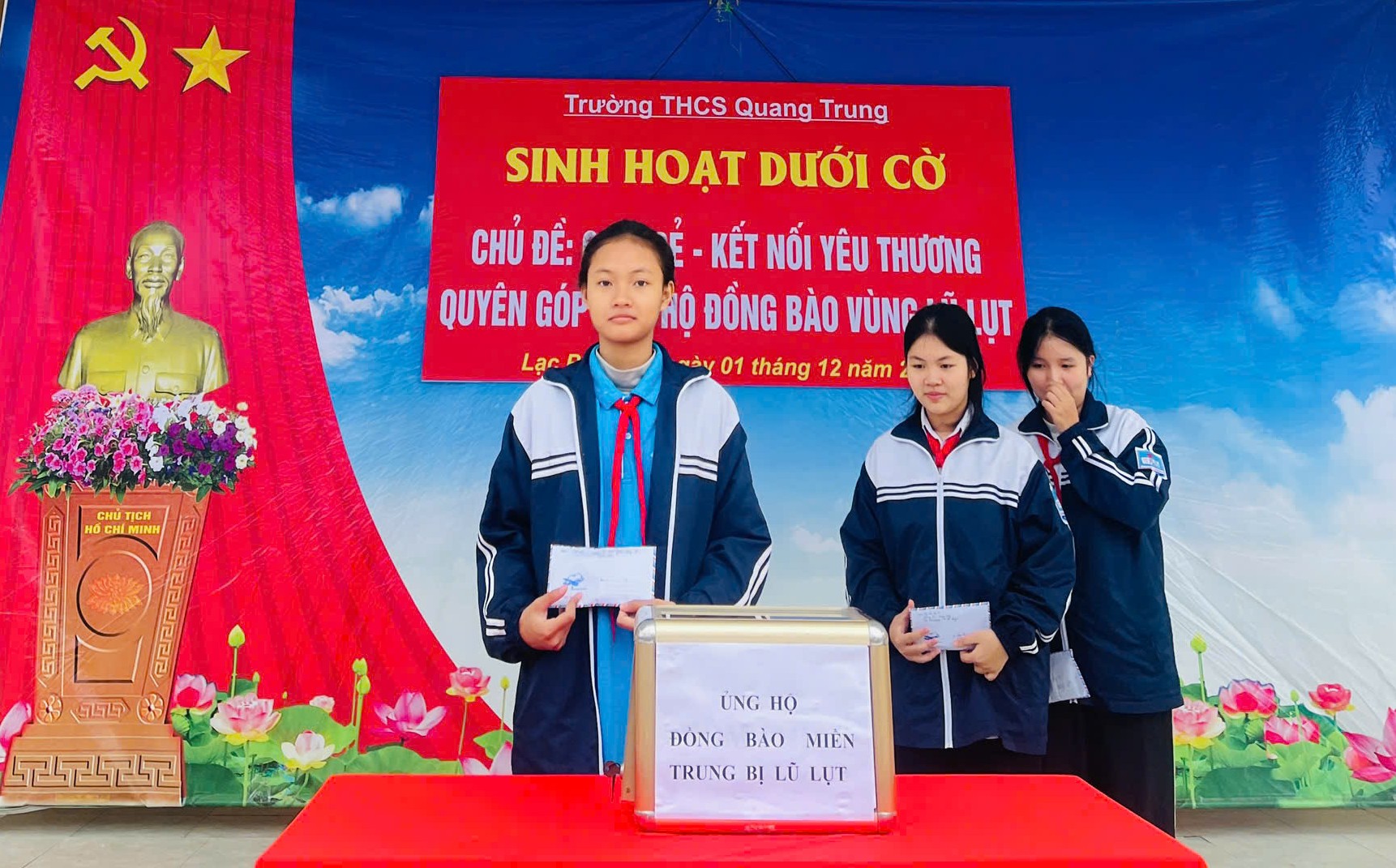 Lời kêu gọi chia sẻ, giúp đỡ đồng bào vùng thiên tai đã chạm đến trái tim của mỗi học sinh và thầy cô trong nhà trường. Hưởng ứng tinh thần đó, Trường THCS Quang Trung chính thức phát động phong trào quyên góp ủng hộ. Các thầy cô giáo trong toàn trường đã tiết kiệm chi tiêu hằng ngày, với mong muốn góp một phần nhỏ bé để giúp người dân vùng lũ vơi bớt khó khăn. Các em học sinh cũng thể hiện tinh thần trách nhiệm và tình yêu thương bằng những hành động rất đẹp: tiết kiệm tiền ăn sáng, dành dụm số tiền mình có và hăng hái xếp hàng bỏ vào hòm quyên góp. Nhiều em dù số tiền không lớn nhưng đều mang theo tấm lòng chân thành, mong muốn được chia sẻ với những bạn nhỏ đang chịu ảnh hưởng của lũ lụt.
