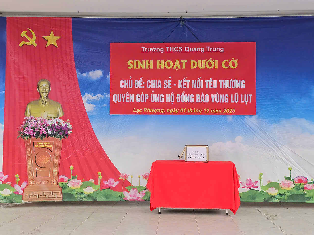 Hưởng ứng lời kêu gọi của Ủy ban MTTQ Việt Nam thành phố Hải Phòng và thực hiện Kế hoạch số 30/KH-MTTQ_BTT ngày 23 tháng 11 năm 2025 của Ban Thường trực MTTQ Việt Nam xã Lạc Phượng về công tác tuyên truyền, vận động ủng hộ đồng bào tỉnh Đắk Lắk khắc phục hậu quả mưa lũ, sáng ngày 01 tháng 12 năm 2025, Trường THCS Quang Trung đã tổ chức buổi Sinh hoạt dưới cờ với chủ đề “Kết nối, chia sẻ yêu thương”.