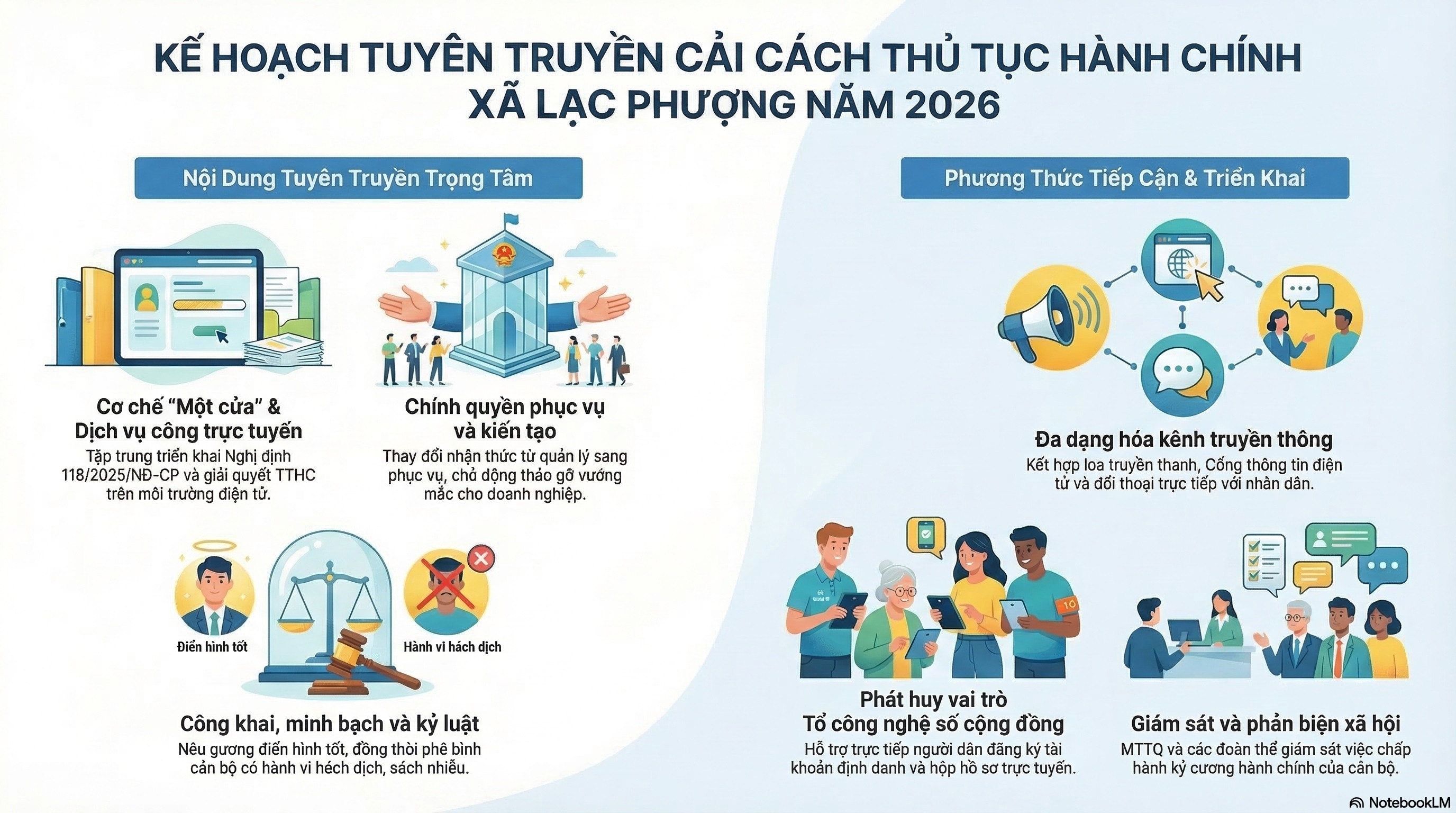 Trong kế hoạch năm 2026, xã Lạc Phượng đặc biệt chú trọng đến vai trò giám sát của nhân dân. Nhân dân hoàn toàn có quyền tham gia các buổi đối thoại trực tiếp giữa UBND xã với người dân và doanh nghiệp để đóng góp ý kiến về các thủ tục hành chính tại địa phương. Nếu gặp khó khăn, vướng mắc hoặc phát hiện hành vi sách nhiễu, cửa quyền của cán bộ, công chức, nhân dân hãy kịp thời phản ánh qua đường dây nóng hoặc các hòm thư góp ý. Mọi phản ánh sẽ được tiếp nhận và xử lý nghiêm theo quy định.