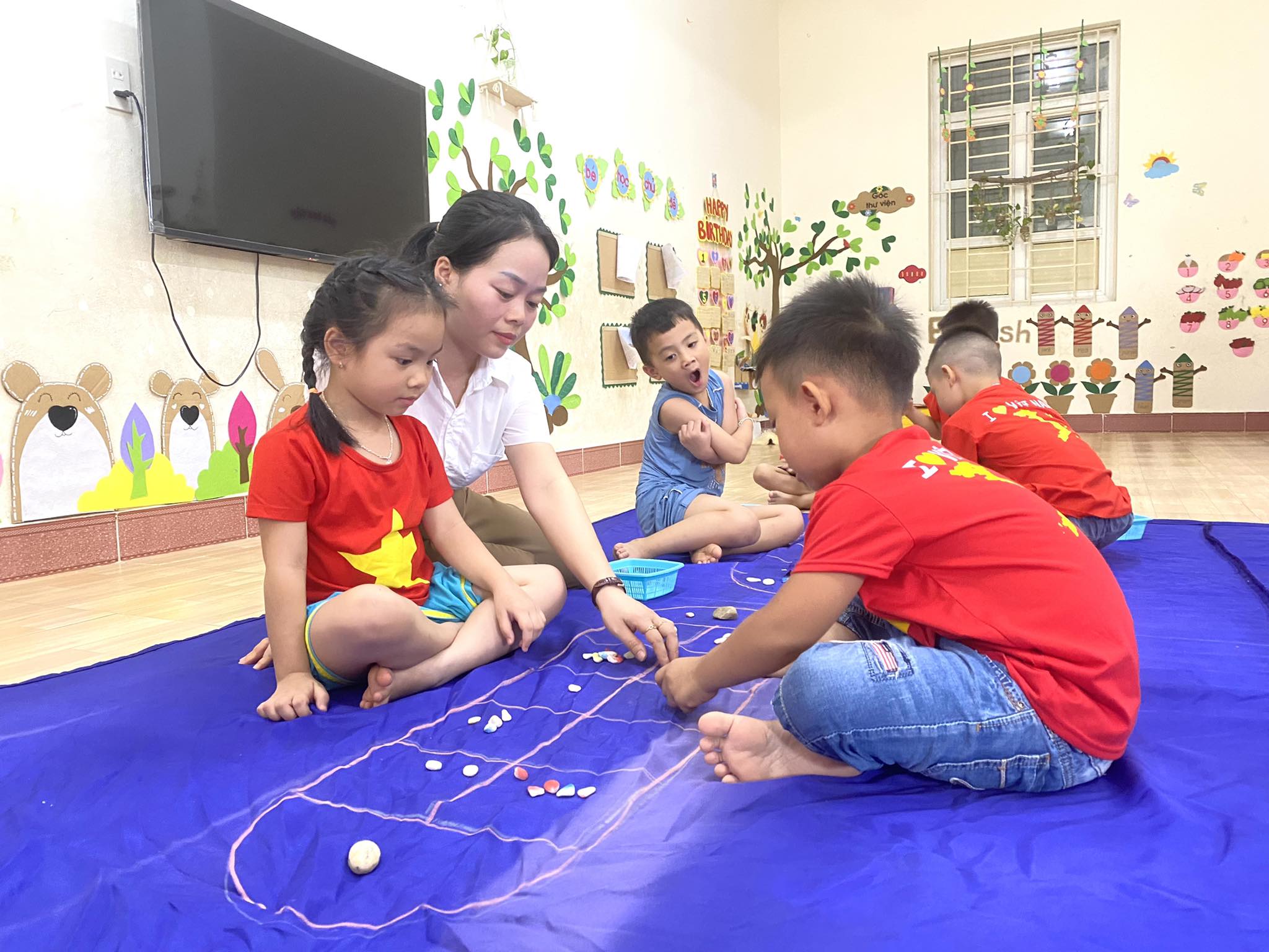 Song song với đó, hoạt động làm quen trò chơi dân gian “Ô ăn quan” cũng được tổ chức hấp dẫn. Cô giáo giới thiệu bàn chơi, gợi hỏi để trẻ biết đây là trò chơi dân gian quen thuộc của bao thế hệ. Trong hoạt động chính, các em chơi theo cặp hoặc theo nhóm, lần lượt bốc sỏi, rải vào các ô theo luật, rồi hào hứng khi được “ăn quân”. Cả lớp cùng theo dõi, cổ vũ tạo nên không khí vui tươi, sôi nổi. Ở phần kết thúc, cô khích lệ sự khéo léo, tinh thần hợp tác và nhấn mạnh ý nghĩa trò chơi – không chỉ rèn tư duy logic, sự kiên nhẫn mà còn giúp trẻ thêm gắn bó với bạn bè.