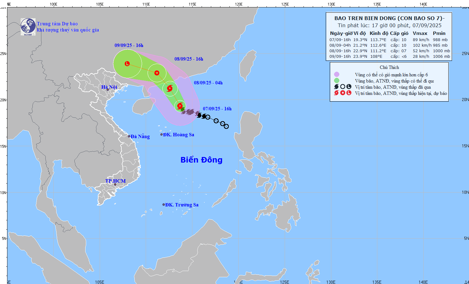 Theo thông tin từ Trung tâm Dự báo Khí tượng Thủy văn quốc gia, hồi 16h ngày 07/9, tâm bão số 7 ở khoảng 19,3°N – 113,7°E, trên vùng biển phía Bắc khu vực Bắc Biển Đông. Sức gió mạnh nhất vùng gần tâm bão cấp 9-10 (75–102km/h), giật cấp 13. Di chuyển theo hướng Tây Bắc khoảng 10-15km/giờ.
